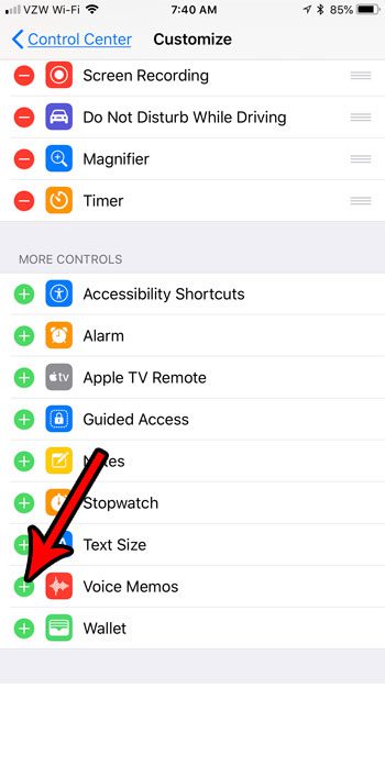 Βήμα 4: Πατήστε το+κουμπί στα αριστερά τουΦωνικά Σημήματαγια να το προσθέσετε στο κέντρο ελέγχου. Σημειώστε ότι χρειάζεται μόνο να το κάνετε αυτό μία φορά. Από τώρα και στο εξής, η εφαρμογή Voice Memos θα βρίσκεται στο κέντρο ελέγχου.