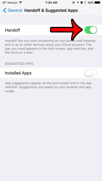 Βήμα 4: Πατήστε το κουμπί στα δεξιάΜεταβίβαση. Θα γνωρίζετε ότι η λειτουργία είναι ενεργοποιημένη όταν υπάρχει πράσινη σκίαση γύρω από το κουμπί. Το Handoff είναι ενεργοποιημένο στην παρακάτω εικόνα.
