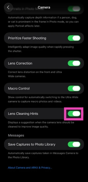 Μεταβείτε στοΡυθμίσεις> Κάμερακαι ενεργοποιήστε τον διακόπτη εναλλαγής δίπλα στο "Συμβουλές καθαρισμού φακών". Αυτή η δυνατότητα είναι διαθέσιμη μόνο σεiOS 26.