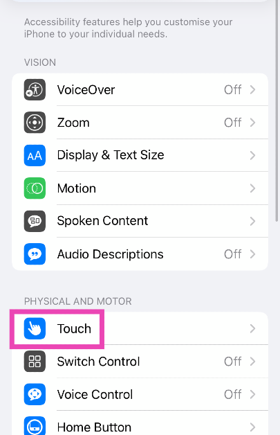 ΠηγαίνωΡυθμίσεις> Αγγίξτεκαι ενεργοποιήστε το διακόπτη εναλλαγής δίπλα στο 'Προσβασιμότητα'.