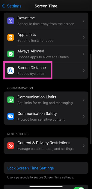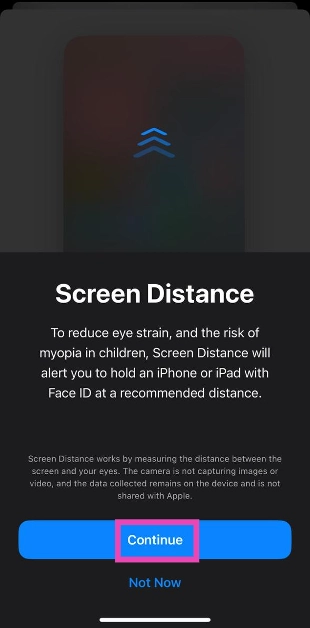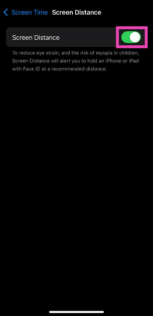 Η λειτουργία απόστασης οθόνης χρησιμοποιεί την πραγματική κάμερα βάθους στο iPhone σας για να υπολογίσετε την απόσταση μεταξύ του προσώπου και της οθόνης. Εάν η οθόνη είναι πιο κοντά σε 12 ίντσες (30 εκατοστά) στο πρόσωπό σας για μεγάλο χρονικό διάστημα,Το iPhone σαςΘα εκδώσει μια ειδοποίηση που θα σας ενημερώσει για αυτό.