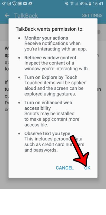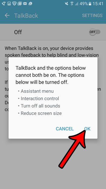 Βήμα 7: Αγγίξτε τοΕΝΤΑΞΕΙΚουμπί ξανά για να απενεργοποιήσετε τις λειτουργίες στη συσκευή σας που είναι ασυμβίβαστα με το talkback.