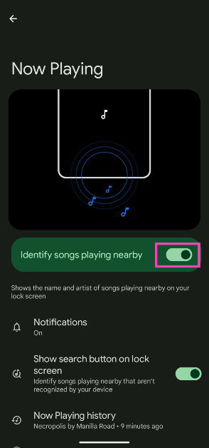 ΠηγαίνωΡυθμίσεις> Ήχος & δόνηση> τώρα παίζονταςΚαι ενεργοποιήστε το διακόπτη εναλλαγής δίπλα στο 'Προσδιορίστε τα τραγούδια που παίζουν κοντά'.