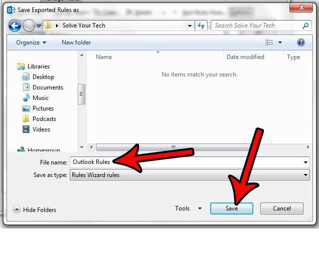 Βήμα 6: Επιλέξτε τη θέση για το αρχείο εξαγόμενου κανόνων, εισαγάγετε ένα όνομα για το αρχείο στοΌνομα αρχείουπεδίο και, στη συνέχεια, κάντε κλικ στοΕκτόςκουμπί.
