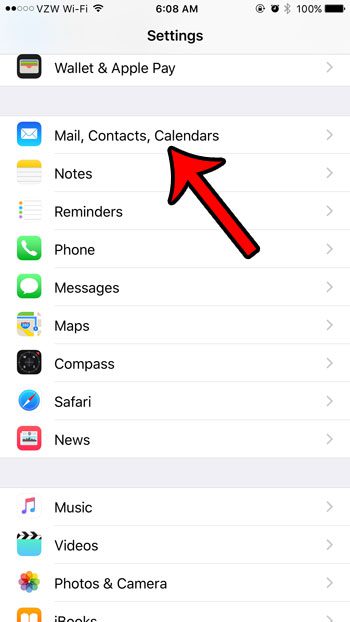 Βήμα 2: Μετακινηθείτε προς τα κάτω και πατήστε τοΤαχυδρομείο, επαφές, ημερολόγιαεπιλογή.