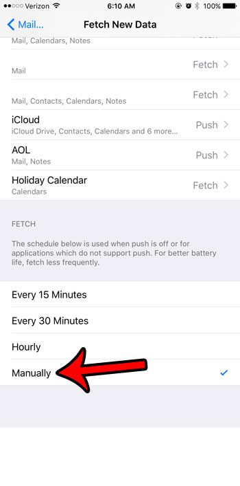 Εάν αλλάζετε τη ρύθμιση λήψης για το email σας επειδή προσπαθείτε να βελτιώσετε τη διάρκεια ζωής της μπαταρίας σας, κάντε κλικ εδώ για να διαβάσετε για μια άλλη επιλογή στο iPhone σας που μπορεί να σας βοηθήσει να βελτιώσετε τη διάρκεια ζωής της μπαταρίας.