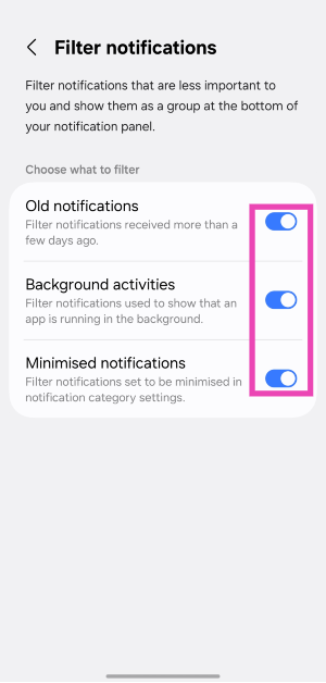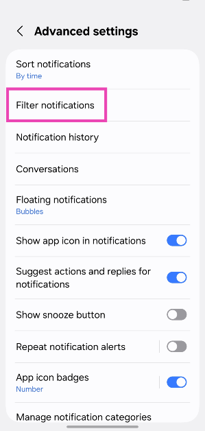 Εάν το τηλέφωνό σας Samsung ενημερώνεται σε ένα UI 7, μπορείτε να φιλτράρετε ειδοποιήσεις πηγαίνονταςΡυθμίσεις> Ειδοποιήσεις> Προηγμένες ρυθμίσεις> Ειδοποιήσεις φίλτρουκαι ενεργοποιώντας τις εναλλαγές-διακόπτες δίπλα στις προτιμώμενες κατηγορίες σας.