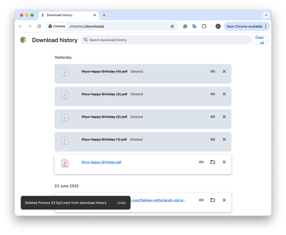 Στο πρόγραμμα περιήγησης Chrome, μπορείτε να πατήσετε την εντολή - Shift - J για να ανοίξετε την καρτέλα Ιστορικό λήψης. Και πάλι, εδώ, μπορείτε να διαγράψετε παλιά αντικείμενα χωρίς να διαγράψετε το αρχείο που αποθηκεύεται στο Mac σας.