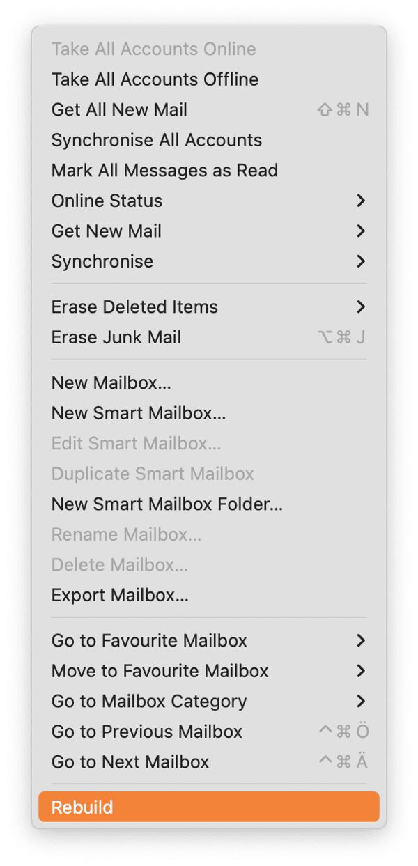 Όταν είστε έτοιμοι, επιλέξτε τον λογαριασμό αλληλογραφίας σας στην αριστερή πλαϊνή μπάρα. Στη συνέχεια, μεταβείτε στο Mailbox> Ανακατασκευή. Αυτό θα μπορούσε να διαρκέσει λίγο.