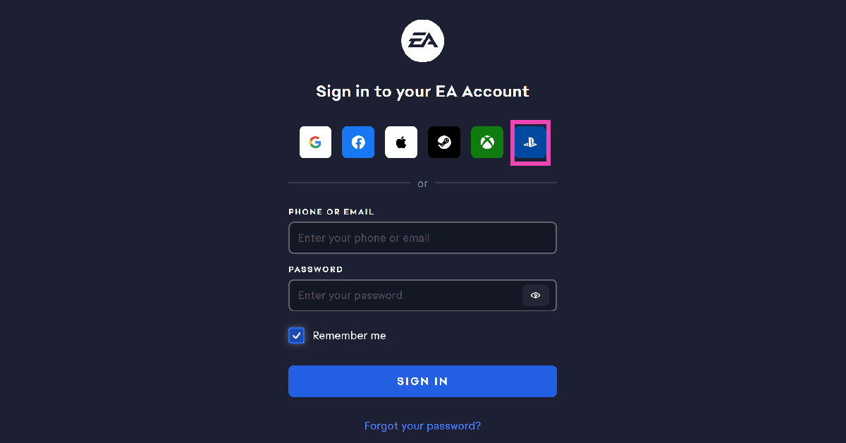 Μεταβείτε στην επίσημη ιστοσελίδα της ΕΑ, κάντε κλικ στο εικονίδιο του προφίλ, επιλέξτε Συνδεθείτε και, στη συνέχεια, κάντε κλικ στο εικονίδιο PS. Εισαγάγετε τα διαπιστευτήρια σύνδεσης PS για να συνδέσετε τους δύο λογαριασμούς.