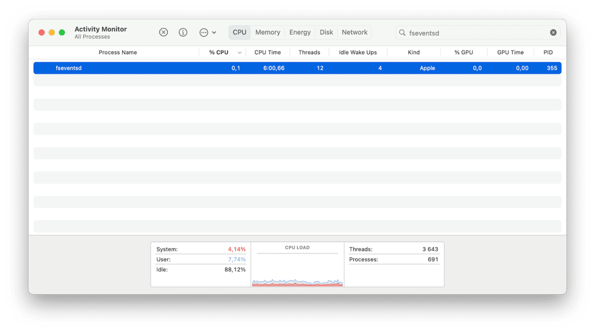 - Αναζητήστε το FSEVENTSD. Εάν βρίσκεται κοντά στην κορυφή της λίστας, ελέγξτε τους κύκλους CPU % CPU ή τη χρήση RAM. Θα πρέπει να είναι πολύ χαμηλά, κλάσματα ενός % για τη χρήση της CPU. Εάν είναι υψηλότερο από αυτό, πιθανότατα έχει πρόβλημα.