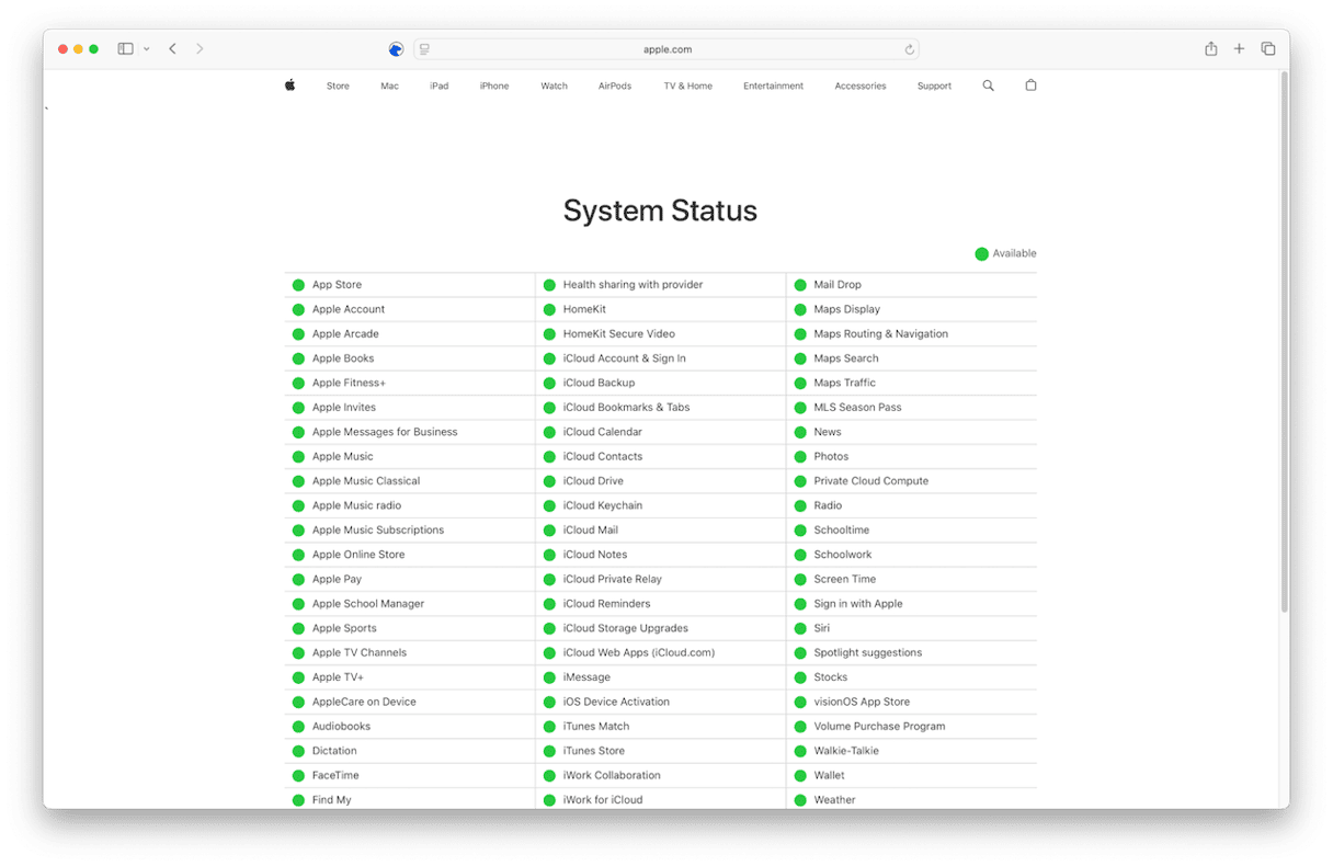 Είναι σπάνιο για τους διακομιστές της Apple να είναι κάτω, αλλά αυτό συμβαίνει. Κανονικά, αν αυτό συνέβη για το ICLoud Private Relay, θα δείτε ένα μήνυμα που λέει ότι το ICLoud Private Relay δεν είναι διαθέσιμο, αντί για το Mac σας δεν μπορεί να συνδεθεί με αυτό, αλλά αξίζει τον έλεγχο.