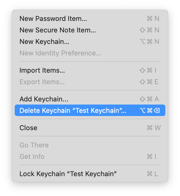 - Κάντε κλικ στο μενού αρχείων και επιλέξτε Διαγραφή Keychain. Μπορείτε επίσης να κάνετε δεξί κλικ ή να κάνετε κλικ στον έλεγχο του keychain και να επιλέξετε Delete Keychain.