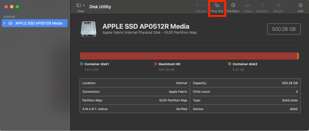 Επιλέξτε το Apple SSD και επιλέξτε Πρώτες Βοηθείες στην κορυφή. Ακολουθήστε τυχόν προτροπές στην οθόνη.