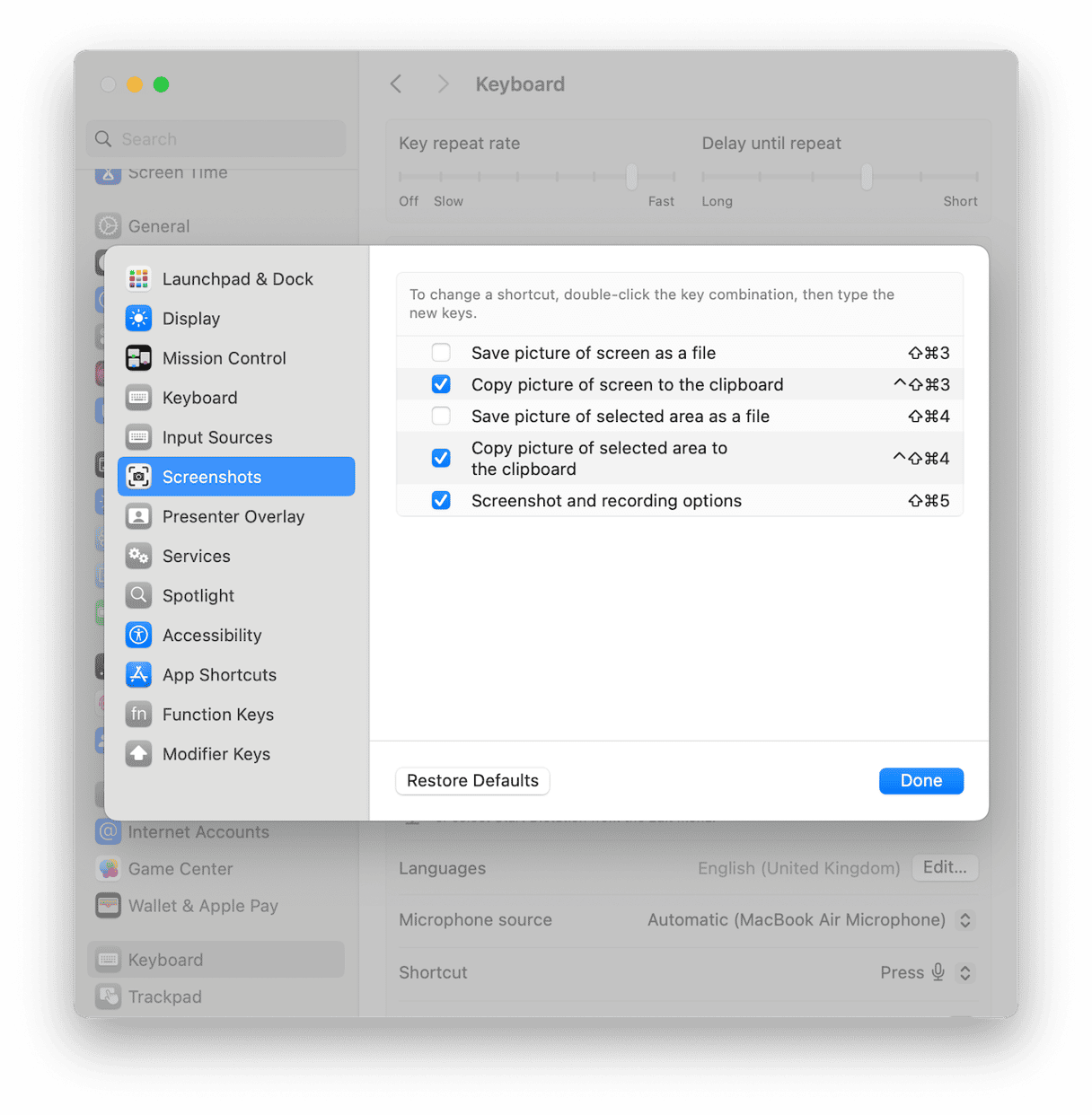 Εάν δεν έχετε εγκατεστημένο ένα εργαλείο οθόνης τρίτου μέρους, ελέγξτε ότι η προεπιλεγμένη συντόμευση πληκτρολογίου για το εργαλείο screenshot στο MACOS δεν έχει αλλάξει.