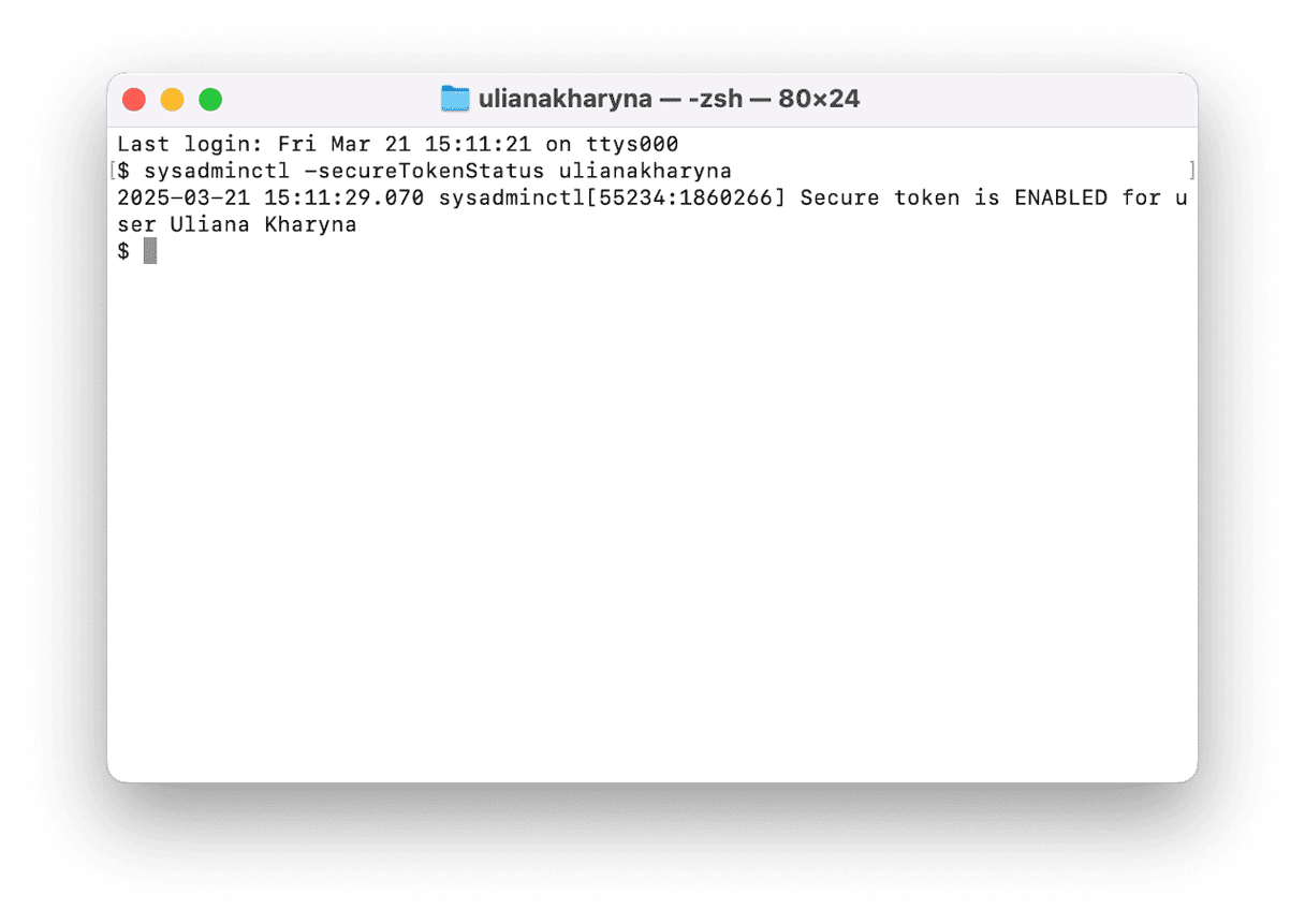 sysadminctl -secureTokenStatus <username> - Εάν το τερματικό επιβεβαιώσει ότι είναι ενεργοποιημένο το ασφαλές διακριτικό, απενεργοποιήστε το χρησιμοποιώντας αυτήν την εντολή: