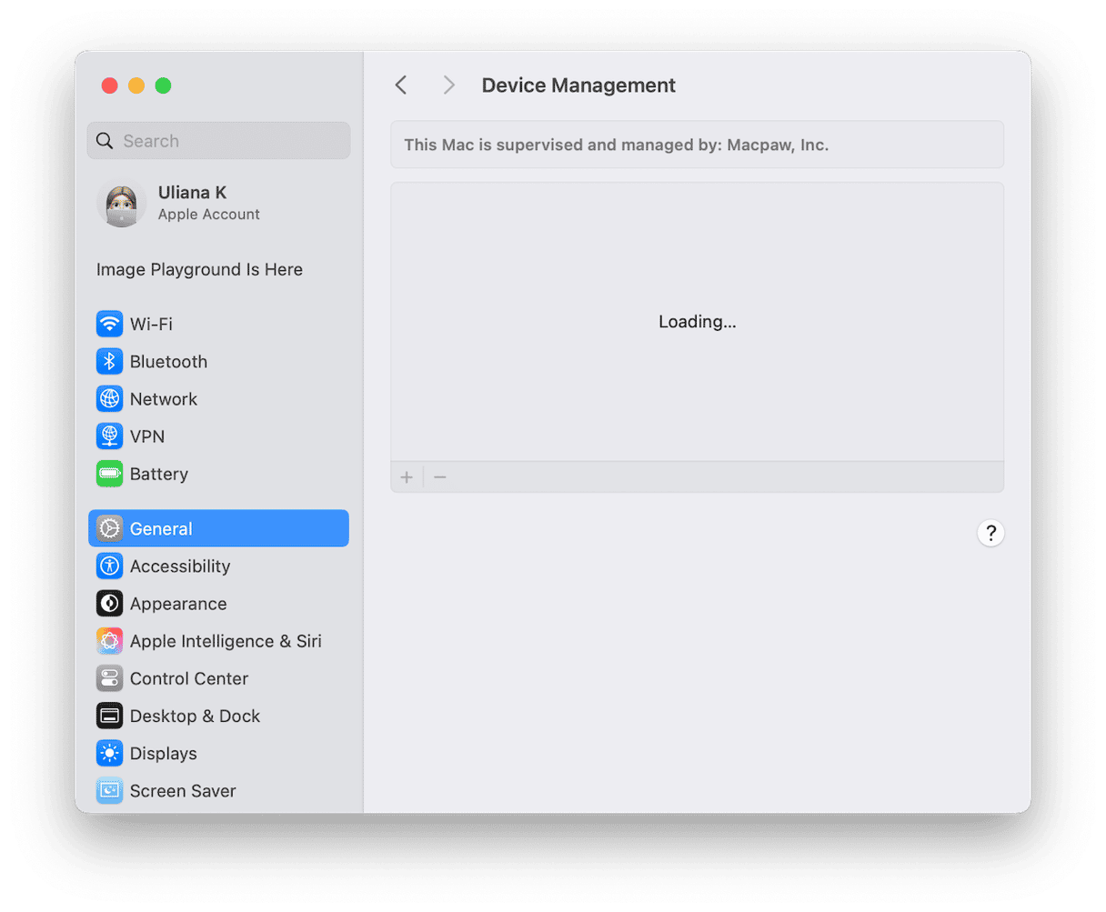 - Επιλέξτε Γενικά, στη συνέχεια διαχείριση συσκευών (Προστασία προσωπικών δεδομένων & ασφάλεια> Προφίλ σε MacOS Sonoma ή μεγαλύτερα).