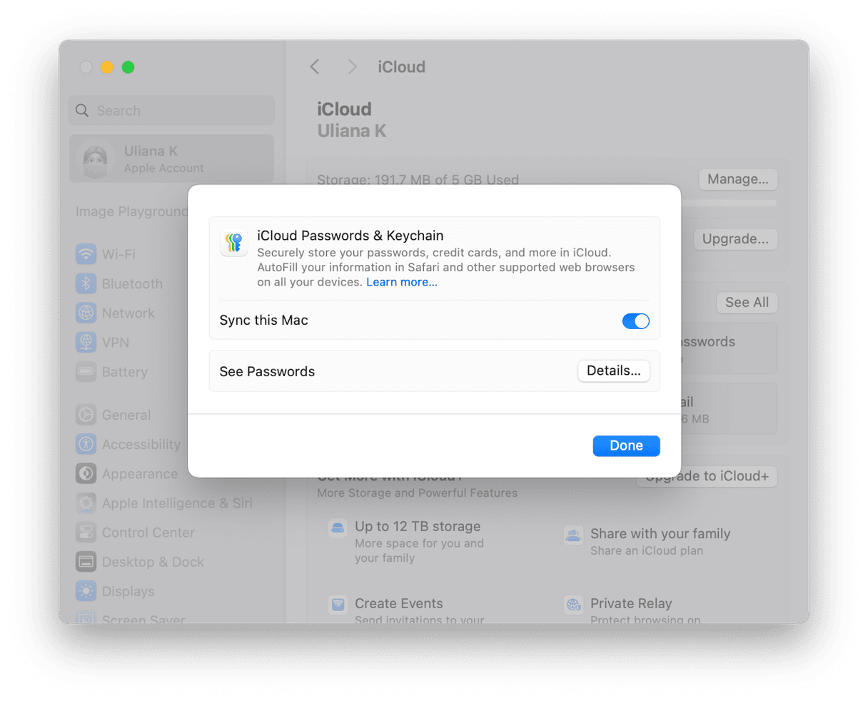 - Στο MacOS Sequoia, κάντε κλικ στην επιλογή Κωδικοί πρόσβασης. Βεβαιωθείτε ότι ο «συγχρονισμός αυτού του Mac» είναι ενεργοποιημένος. Στο MacOS Sonoma και νωρίτερα, επιλέξτε κωδικούς πρόσβασης και keychain. Βεβαιωθείτε ότι οι κωδικοί πρόσβασης και το keychain είναι ενεργοποιημένοι.