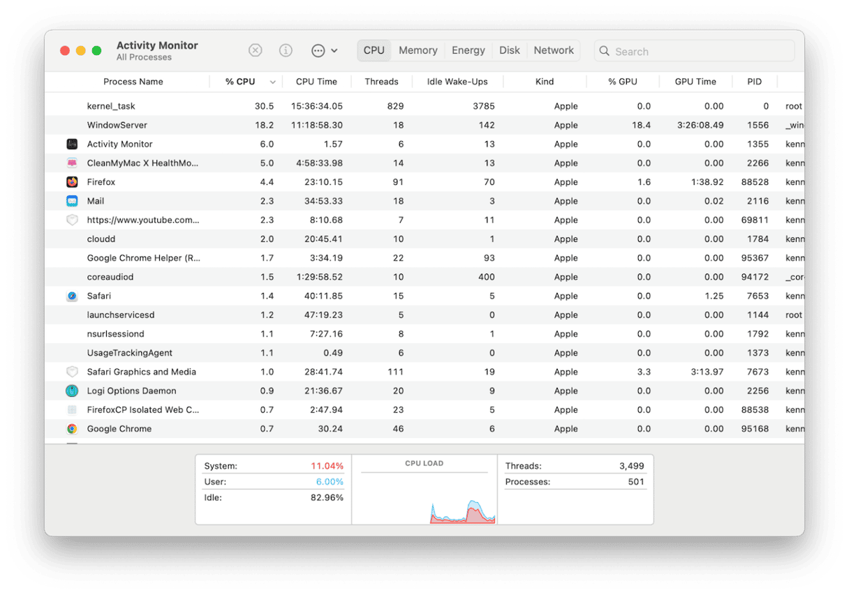 - Θα δείτε διαδικασίες που αναφέρονται κατά σειρά των κύκλων CPU που χρησιμοποιούν. Κανονικά, ο κατάλογος ξεκινά με τους υψηλότερους καταναλωτές και το βέλος δίπλα στην CPU στην κορυφή της στήλης δείχνει προς τα κάτω. Εάν δεν συμβαίνει αυτό, κάντε κλικ στην κεφαλίδα της στήλης για να δείτε τους υψηλότερους καταναλωτές στην κορυφή.
