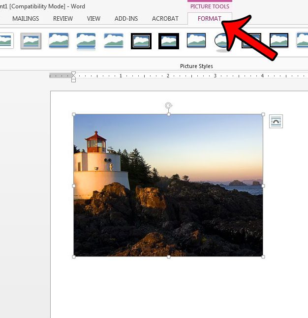 Βήμα 2: Κάντε κλικ στην εικόνα για να την επιλέξετε. Αυτό θα προσθέσει έναΕργαλεία εικόνας: μορφήκαρτέλα στο επάνω μέρος του παραθύρου, το οποίο γίνεται η ενεργή καρτέλα.