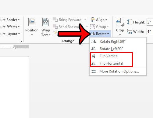 Μια επιλογή που είναι διαθέσιμη για εσάς για επεξεργασία εικόνων στο Word είναι ένα εργαλείο περιστροφής που μπορεί να χρησιμοποιηθεί για να αναστρέψει μια εικόνα κάθετα ή οριζόντια. Αυτό θα τροποποιήσει την εικόνα έτσι ώστε να γίνει μια καθρέφτη έκδοση του εαυτού του.