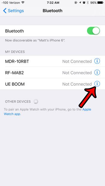 Ο οδηγός μας συνεχίζεται παρακάτω με πρόσθετες πληροφορίες σχετικά με το πώς να ξεχάσετε μια συσκευή Bluetooth στο iOS 9, συμπεριλαμβανομένων των εικόνων αυτών των βημάτων.