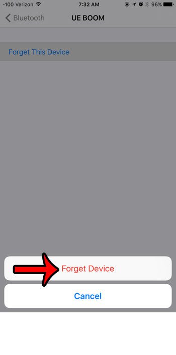 Βήμα 5: Πατήστε το κόκκινοΞεχάστε τη συσκευήκουμπί στο κάτω μέρος της οθόνης για να επιβεβαιώσετε ότι θέλετε να αφαιρέσετε αυτήν τη συσκευή Bluetooth από το iPhone σας.