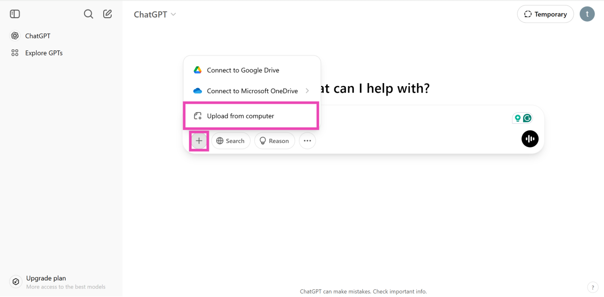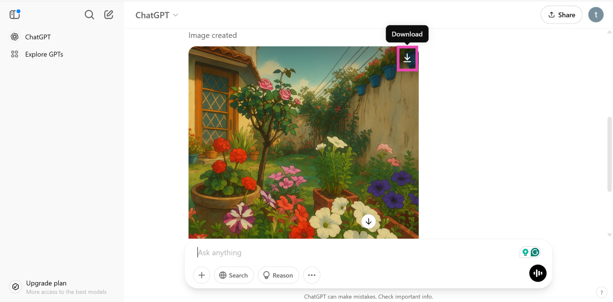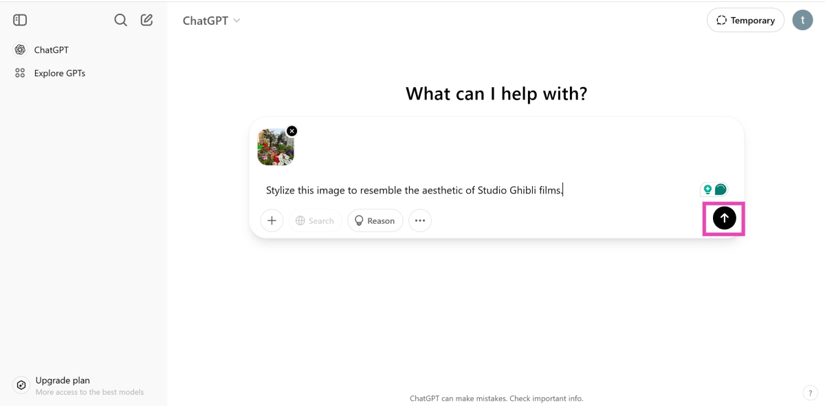 Μεταβείτε στον ιστότοπο ChatGpt, κάντε κλικ στο εικονίδιο συν, ανεβάστε την εικόνα από τον υπολογιστή σας, πληκτρολογήστε 'stylize αυτή την εικόνα για να μοιάζει με την αισθητική του Studio Ghibli Films' ως προτροπή και πατήστε Enter.