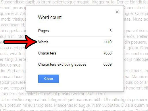 - Όταν ελέγχετε τον αριθμό των λέξεων στα έγγραφα Google, βλέπετε διάφορες πληροφορίες, συμπεριλαμβανομένου του αριθμού σελίδων, του συνολικού αριθμού λέξεων, του αριθμού χαρακτήρων και των χαρακτήρων που αποκλείουν τους χώρους που μετράνε.