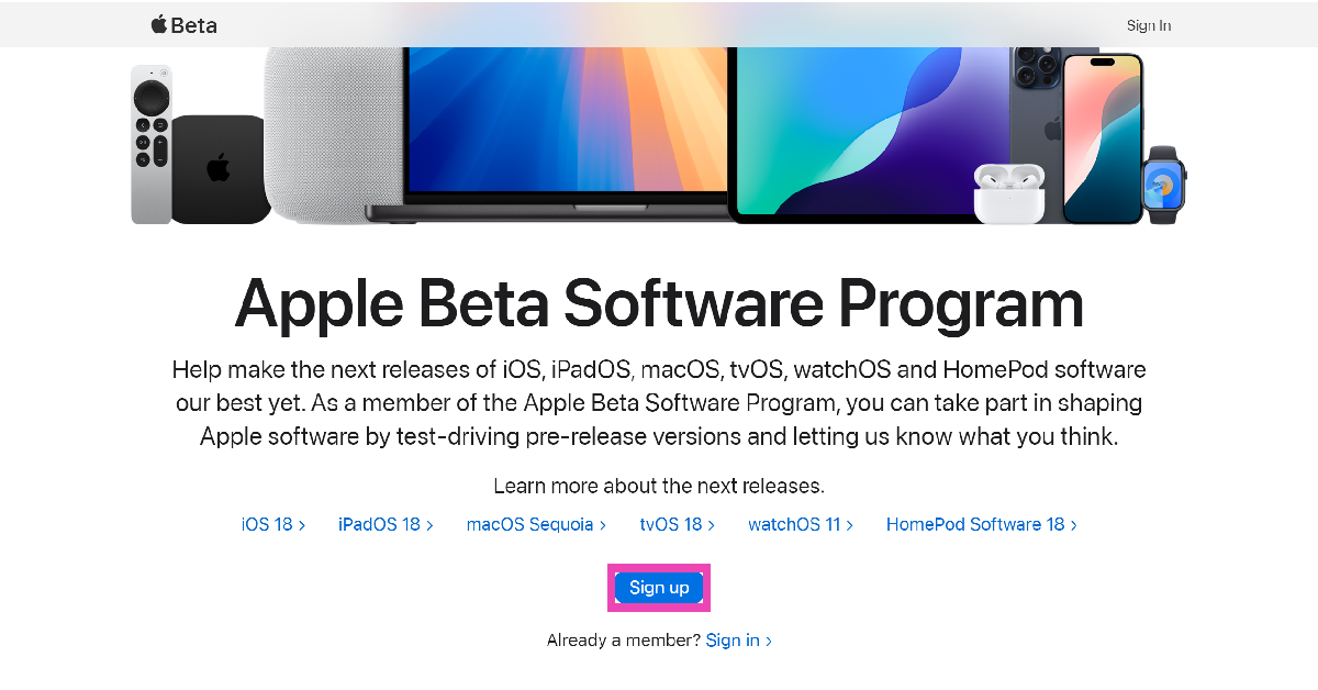 Βήμα 1:Πηγαίνωhttps://beta.apple.com/καιεγγραφείτεΧρησιμοποιώντας το αναγνωριστικό της Apple.
