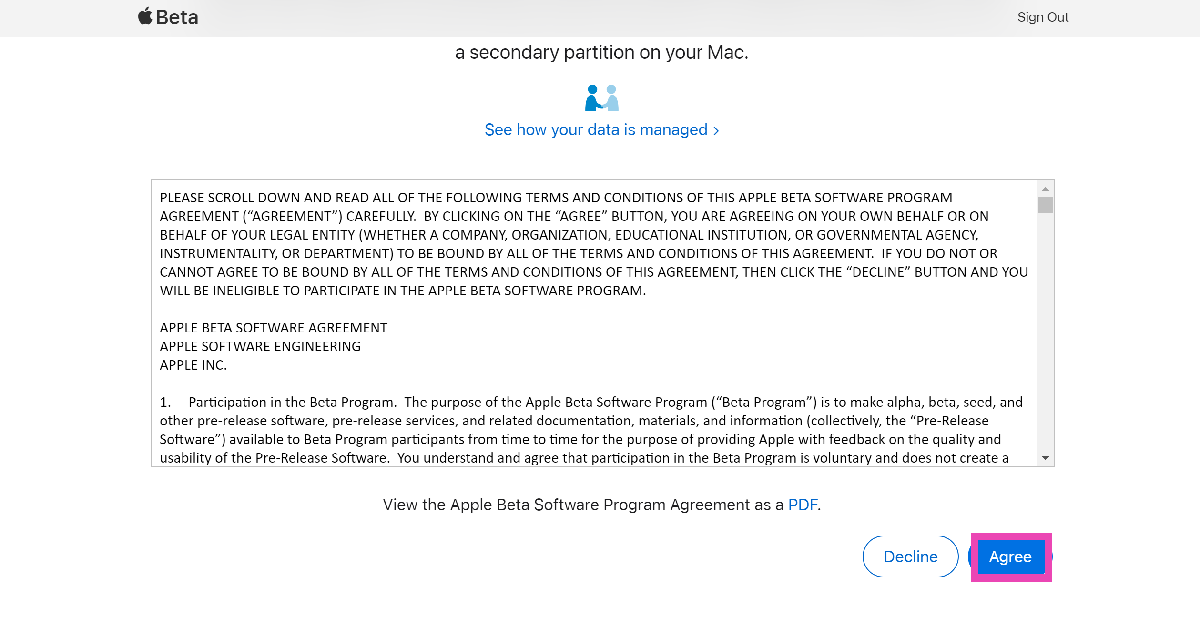 Βήμα 2:Συμφωνώ με τοΣυμφωνία προγράμματος προγράμματος λογισμικού Apple Beta.