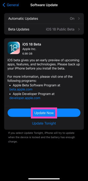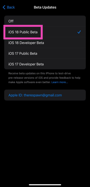 Βήμα 6:ΕπιλέγωiOS 18 δημόσιο beta.