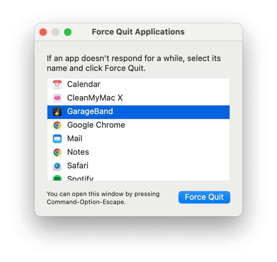 - Επιλέξτε την κατεψυγμένη εφαρμογή από τη λίστα και κάντε κλικ στην επιλογή Force Quit.