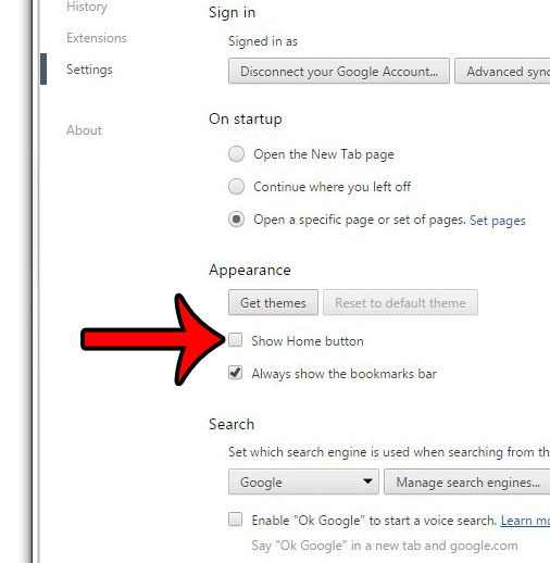 Ο οδηγός μας συνεχίζεται παρακάτω με πρόσθετες πληροφορίες σχετικά με την απόκρυψη του κουμπιού Home στο πρόγραμμα περιήγησης ιστού Google Chrome Chrome, συμπεριλαμβανομένων των εικόνων αυτών των βημάτων.