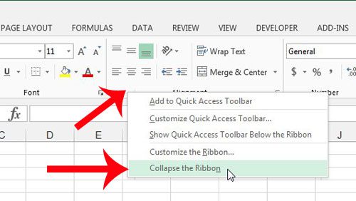 Βήμα 2: Κάντε δεξί κλικ σε ένα κενό χώρο στην κορδέλα και, στη συνέχεια, κάντε κλικ στοΚατάρρευση της κορδέλαςεπιλογή.