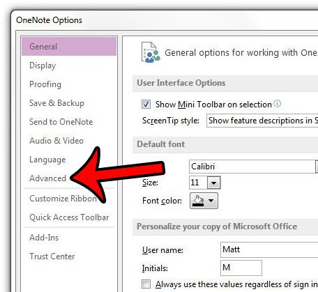- Κάντε κλικ στοΠροχωρημένοςκαρτέλα στοΕπιλογές OneNoteπαράθυρο.