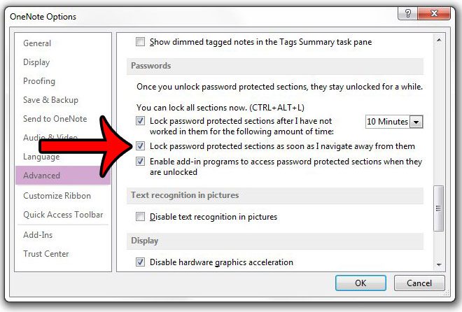 Τα βήματα σε αυτό το άρθρο θα αλλάξουν τις ρυθμίσεις για την εγκατάστασή σας OneNote, έτσι ώστε τυχόν τμήματα που προστατεύονται από τον κωδικό πρόσβασης να απαιτούν τον κωδικό πρόσβασης να επανεξεταστεί αμέσως μόλις περιηγηθείτε μακριά από αυτά. Αυτό το άρθρο θα υποθέσει ότι έχετε ακολουθήσει οδηγίες παρόμοιες με αυτές σε αυτό το άρθρο για να προστατεύσετε τον κωδικό πρόσβασης σε μια ενότητα του σημειωματάριό σας.