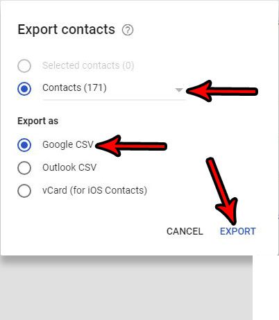 Βήμα 4: Επιβεβαιώστε ότι επιλέγονται οι επαφές σας και οι επιλογές Google CSV και, στη συνέχεια, κάντε κλικ στοΕξαγωγήκουμπί για λήψη του αρχείου.