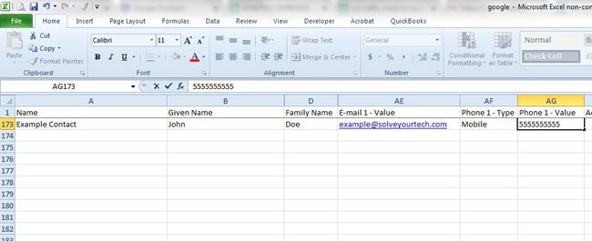 Σημειώστε ότι ενδέχεται να υπάρχει ένας πολύ μεγάλος αριθμός κολώνων σε αυτό το υπολογιστικό φύλλο και ότι σημαντικά πεδία όπως η "τιμή ηλεκτρονικού ταχυδρομείου 1" και το "τηλέφωνο 1-τιμή" ενδέχεται να απαιτούν να μετακινηθείτε αρκετά μακριά. Για παράδειγμα, αυτά τα πεδία ήταν στήλες ΑΕ και AG, αντίστοιχα, στο αρχείο μου CSV. Έχω κρυφτεί μερικές στήλες στην παρακάτω εικόνα, ώστε να μπορείτε να δείτε τι είναι οι σημαντικές επισημασμένες ως και πού βρίσκονται.