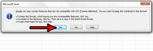 Βήμα 9: Κάντε κλικ στοΝαίκουμπί για να επιβεβαιώσετε ότι ορισμένες λειτουργίες ενδέχεται να μην είναι συμβατές με τη μορφή αρχείου CSV.