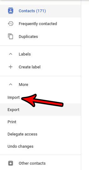 Βήμα 10: Επιστρέψτε στην καρτέλα Επαφών Google στο πρόγραμμα περιήγησής σας και κάντε κλικ στοΕισαγωγήΕπιλογή στη στήλη στην αριστερή πλευρά του παραθύρου.
