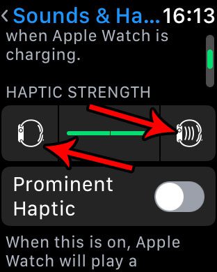 Βήμα 3: Μετακινηθείτε προς τα κάτω και ρυθμίστε τη ρύθμιση κάτω από την απτική αντοχή μέχρι να βρείτε την προτιμώμενη ρύθμιση. Το κουμπί στα αριστερά της πράσινης γραμμής θα μειώσει την απτική αντοχή της Apple Watch, ενώ το κουμπί στα δεξιά της γραμμής θα το αυξήσει.