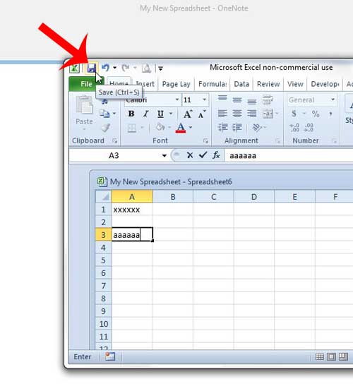 Βήμα 5: Εισαγάγετε τα στοιχεία σας στο υπολογιστικό φύλλο και, στη συνέχεια, κάντε κλικ στοΕκτόςεικονίδιο στο επάνω μέρος του παραθύρου για να αποθηκεύσετε το αρχείο στο φορητό υπολογιστή OneNote.