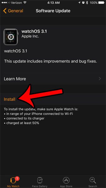 Ο οδηγός μας παρακάτω θα σας δείξει πού να πάτε για να εκτελέσετε την ενημέρωση του Watch OS για το Apple Watch σας. Έτσι, μόλις το ρολόι σας βρίσκεται σε σειρά του iPhone σας που είναι συνδεδεμένο με Wi-Fi, το ρολόι σας είναι συνδεδεμένο με τον φορτιστή του και έχει χρέωση τουλάχιστον 50%, τότε μπορείτε να ακολουθήσετε τον παρακάτω οδηγό για να εγκαταστήσετε την ενημέρωση.