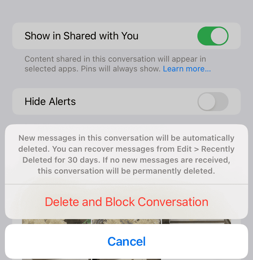 Επειδή οι ομάδες SMS/MMS δεν σας δίνουν τη δυνατότητα να αφήσετε μια συνομιλία (επειδή δεν χρησιμοποιείτε μια πλατφόρμα άμεσων μηνυμάτων) ο τρόπος εξόδου από τη συζήτηση είναι είτε με τη σίγαση του νήματος είτε τη χρήση της επιλογής "διαγραφή και μπλοκάρισμα της συνομιλίας".