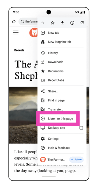 Ανοίξτε την ιστοσελίδα ή το άρθρο στο Chrome, πατήστε τις ελλείψεις, επιλέξτε 'Ακούστε αυτήν τη σελίδα' και πατήστε 'Play'.