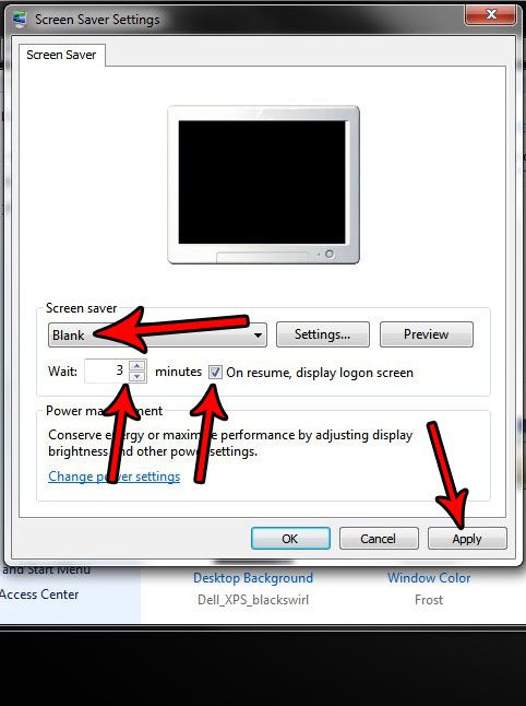 Βήμα 3: Κάντε κλικ στο αναπτυσσόμενο μενού κάτωΠροειδοποιητής οθόνηςκαι επιλέξτε τοΚενόεπιλογή εάν θέλετε μια μαύρη οθόνη. Μπορείτε επίσης να επιλέξετε έναν από τους άλλους αποταμιευτές οθόνης, αν προτιμάτε. Ρυθμίστε το χρονικό διάστημα μετά από τον οποίο θέλετε να ενεργοποιηθεί η προφυλακτική οθόνη και, στη συνέχεια, ελέγξτε το πλαίσιο στα αριστερά τουΣτο βιογραφικό σημείωμα, οθόνη σύνδεσης εμφάνισης. Όταν τελειώσετε, κάντε κλικ στοΕφαρμόζωκουμπί.
