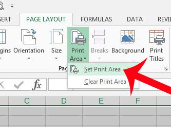 Βήμα 4: Κάντε κλικ στοΠεριοχή εκτύπωσηςκουμπί στοΡύθμιση σελίδαςΤμήμα της πλοηγικής κορδέλας και, στη συνέχεια, κάντε κλικ στοΟρισμός επιφάνειας εκτύπωσηςεπιλογή.