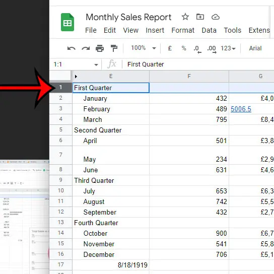 Στην αρχή, μπορεί να φαίνεται ότι θα έχετε ένα πρόβλημα να δημιουργήσετε μια σειρά κεφαλίδων Google Sheets σε αυτή την κατάσταση, αλλά στην πραγματικότητα υπάρχει μια σύντομη σειρά βημάτων που μπορείτε να χρησιμοποιήσετε για να τοποθετήσετε μια κενή σειρά πάνω από το υπάρχον περιεχόμενο.