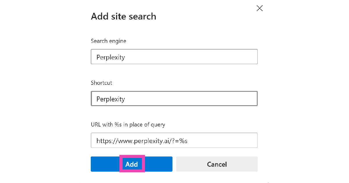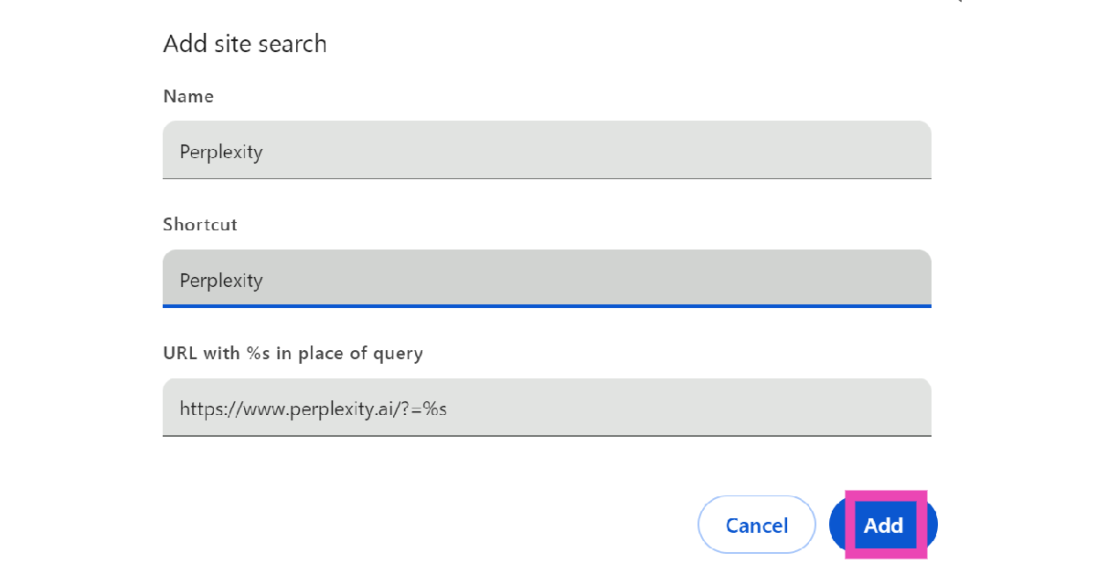Βήμα 6:ΣτοUrlπλαίσιο κειμένου, εισάγετε https://www.perplexity.ai/?q=%s.